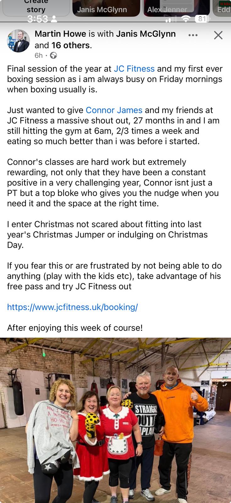 JC Fitness was recommended to me by my husband .. I did a bit of research and I noticed that the bootcamp training was aimed at people with over 3 stone to lose .. it certainly grabbed my attention so I signed up for a free taster session .. quickly before I had the chance to change my mind!! I hardly slept the night before .. I was so anxious! I was worried I wouldn’t be able to do it and I was worried that it was going to be super clicky and that nobody would talk to me! I was also worried about parking but Connor sent me a video showing me exactly where to park and how to get in.