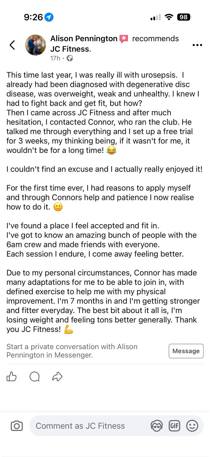 The best thing about JC Fitness is the people! I don’t feel out of place or judged. Everyone has been super welcoming and we have a laugh. It’s not taken too seriously and I feel I can exercise safely within my limits whilst also pushing myself as I get fitter.